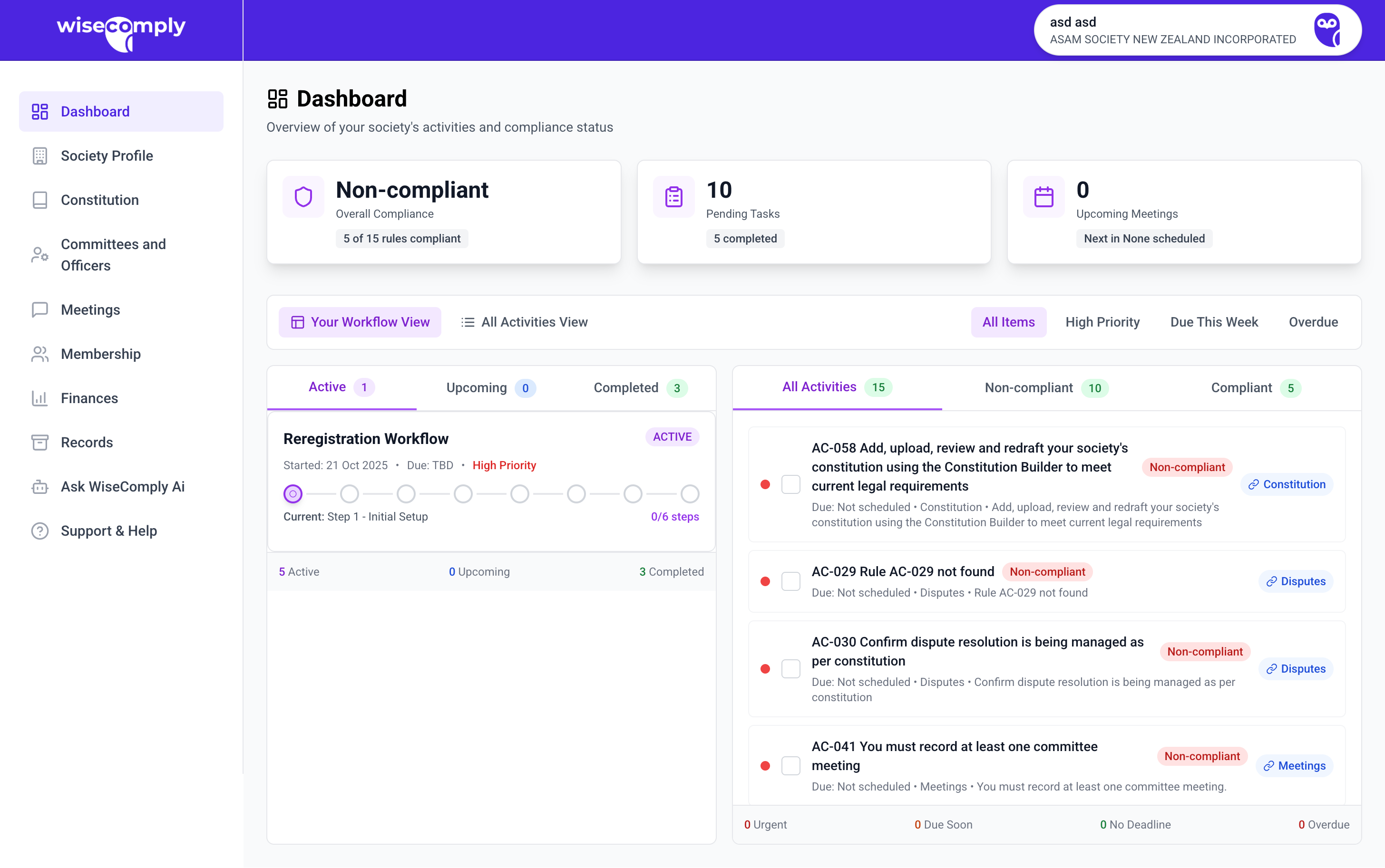 Once the Setup Wizard is complete, you'll be taken to the Dashboard where you can begin managing your society's compliance requirements.