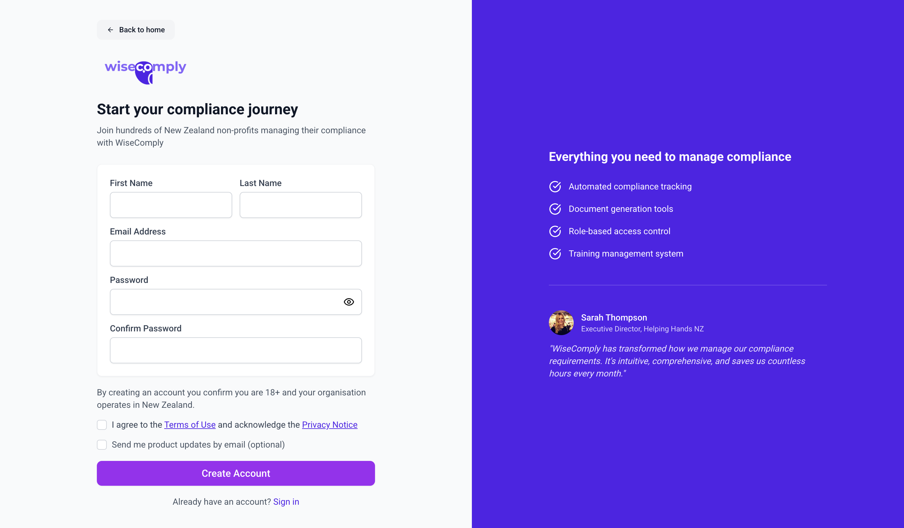 · Create a new WiseComply account with your details