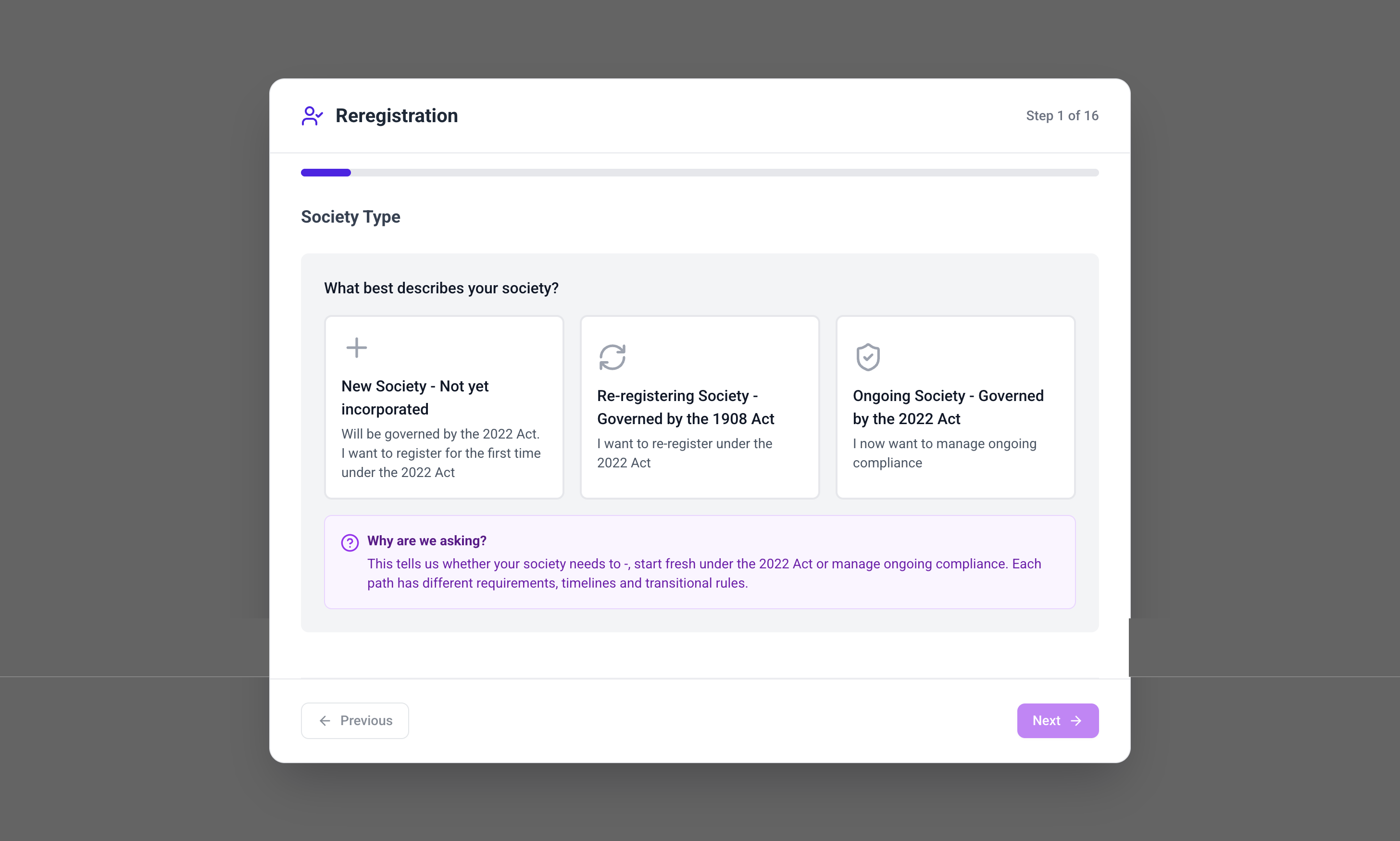 After email verification, you'll be automatically directed to the Setup Wizard. The wizard asks questions about your society to configure WiseComply properly. Refer to the Setup Wizard help guide for detailed information about each question.