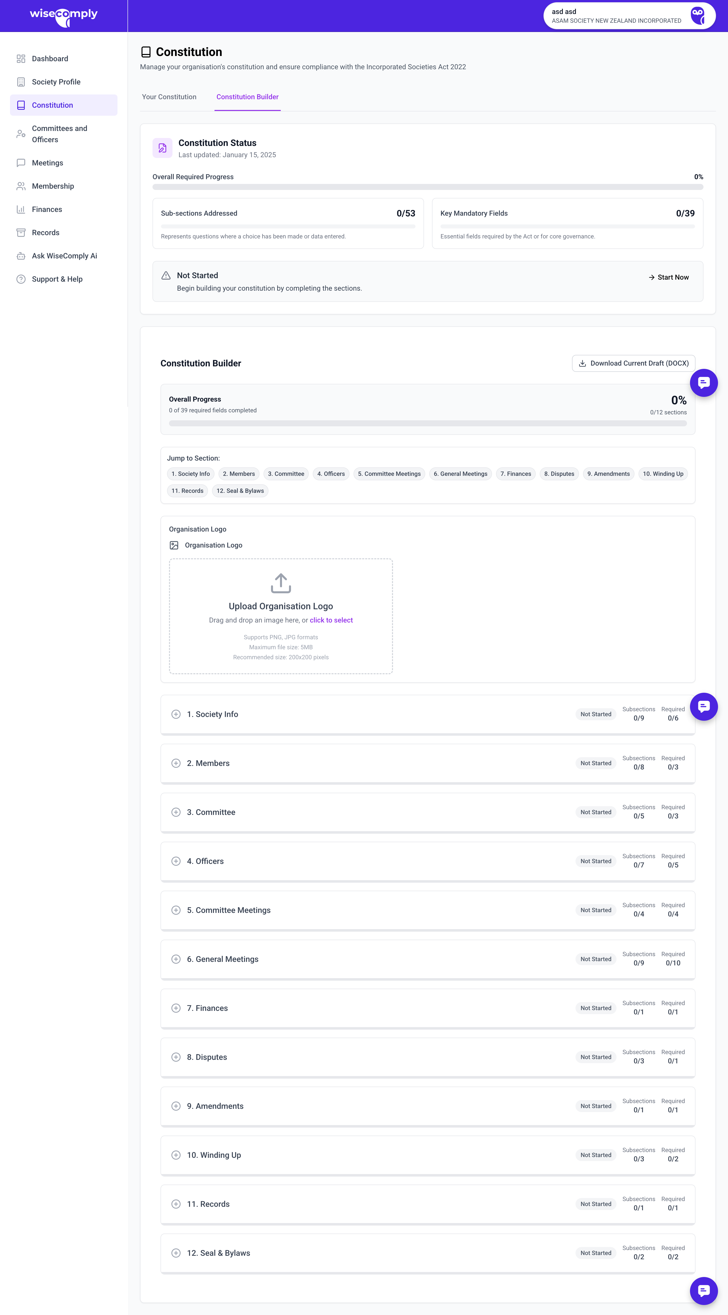 The Constitution page helps societies create or update their constitution to meet the requirements of the Incorporated Societies Act 2022. The built-in Constitution Builder guides users through 12 sections, tracking progress and ensuring all mandatory fields are completed.