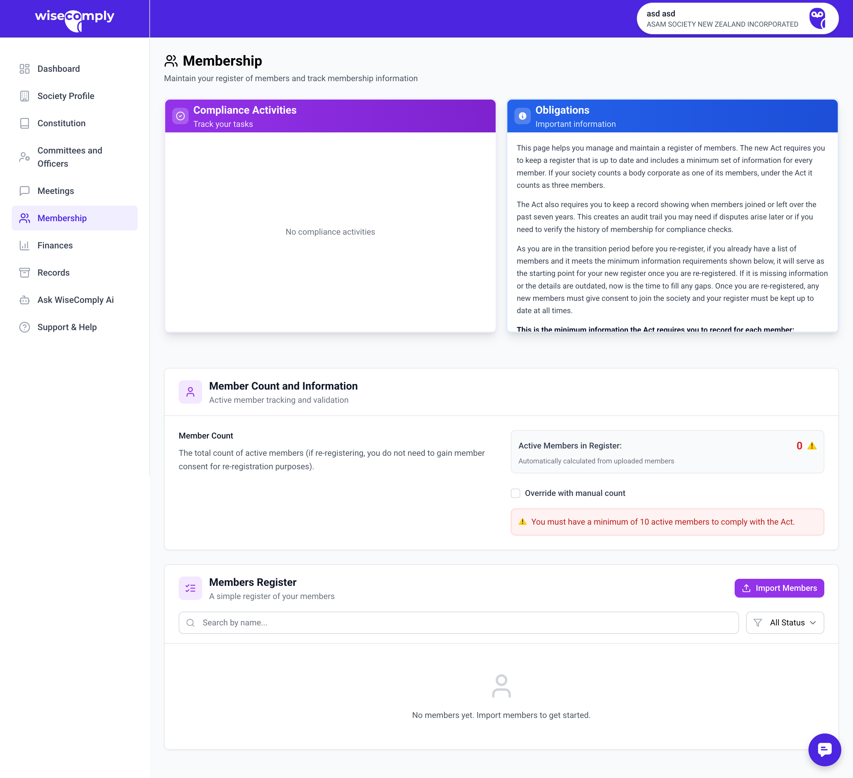 The Membership page helps societies maintain a register of members as required by the Incorporated Societies Act 2022. It records member information, tracks membership numbers, and ensures the society meets minimum member thresholds. The page also manages consent and privacy requirements for member data.