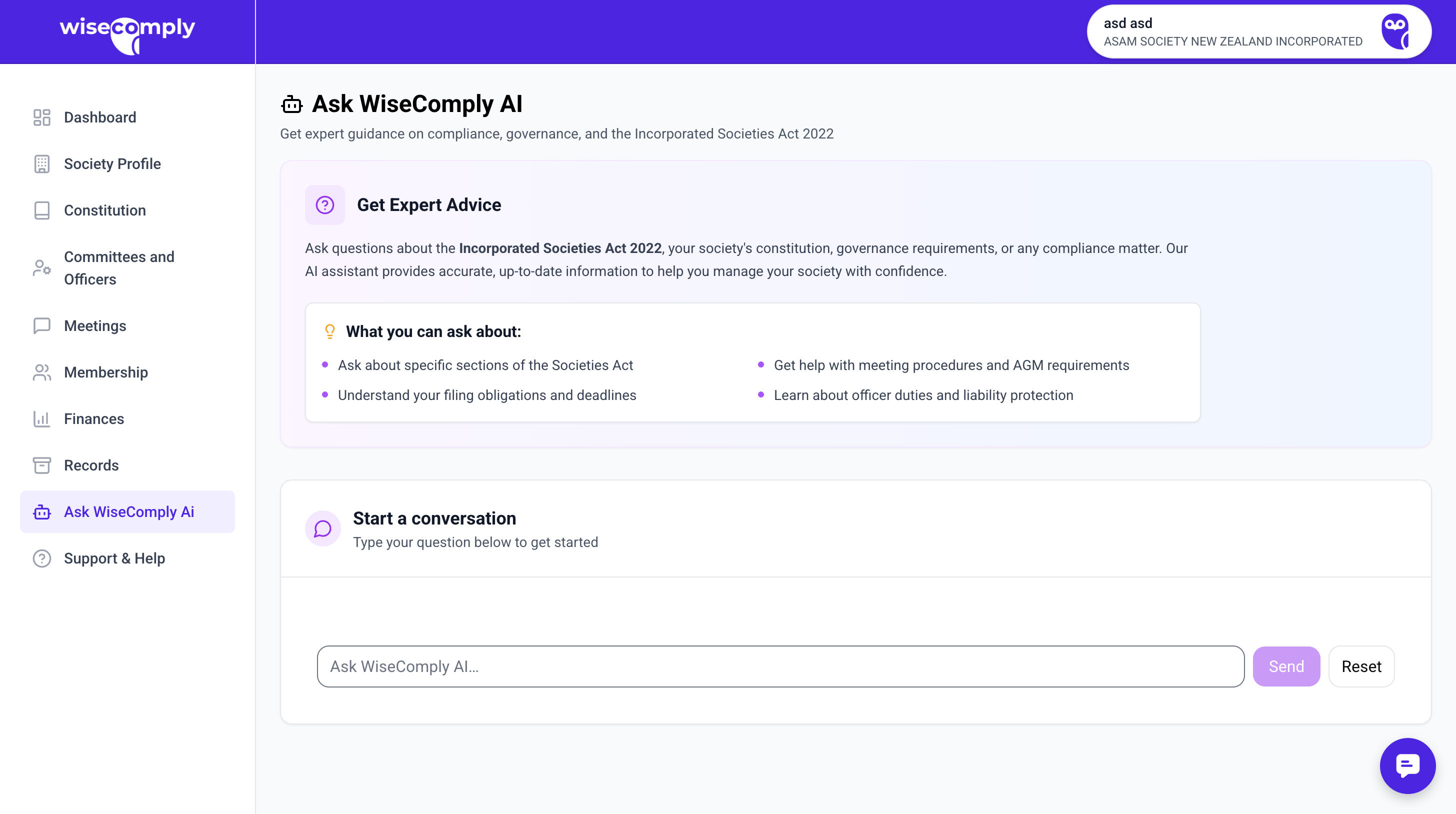 Ask WiseComply AI is an intelligent assistant that provides expert guidance on society management and compliance. Users can ask questions about the Incorporated Societies Act 2022, constitution requirements, governance matters, and any compliance-related topics to get accurate, up-to-date information.